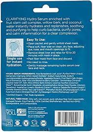 Open packet and gently unfold sheet mask. Place soft, fibre side on clean, dry face, adjusting eye, nose, and mouth openings to fit. Remove sheet liner and relax for 10 to 20 minutes with mask in place. Peel fibre mask from face and discard. No need to rinse. Gently massage remaining hydro serum over face and neck.